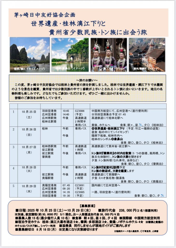 茅ヶ崎日中友好協会企画 ✈2025年10月25日(土)~10月29日(水)「世界遺産・桂林と貴州省少数民族・トン族に出会う旅」 ご関心のある方は、是非お問い合わせください!! 【申込み・問い合わせ先】 茅ヶ崎日本中国友好協会 ... -